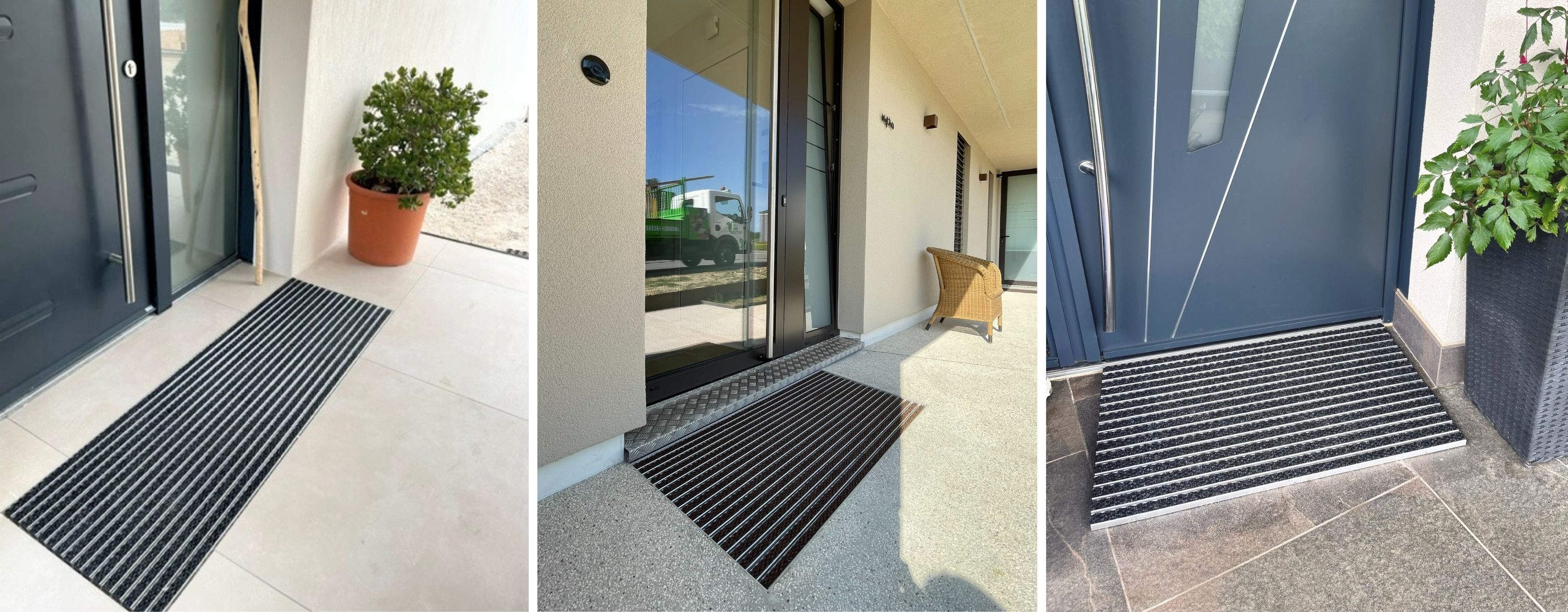 Absorbierende Eingangsmatte auf Aluminiumträgerprofil; Effiziente Beseitigung von Feuchtigkeit. Für normalen bis intensiven Personenverkehr. Robust, aufrollbar und pflegeleicht. Zum Auflegen auf oder Einlassen in den Boden (Aussparung)